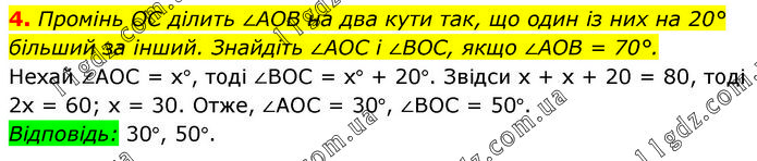 Промінь OC ділить ∠AOB на два кути так, що один із них на 20° більший за інший. Знайдіть ∠AOC і ∠BOC, якщо ∠AOB = 70°. Нехай ∠АОС = х°, тоді ∠ВОС = х° + 20°. Звідси х + х + 20 = 80, тоді 2х = 60; х = 30. Отже, ∠АОС = 30°, ∠ВОС = 50°. Відповідь: 30°, 50°.