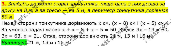 Знайдіть довжини сторін трикутника, якщо одна з них довша за другу на 8 м, а за третю — на 5 м, а периметр трикутника дорівнює 50 м. Нехай сторони трикутника дорівнюють х см, (х – 8) см і (х – 5) см. За умовою задачі маємо х + х – 8 + х – 5 = 50. Звідси 3х – 13 = 50, 3х = 63. х = 21. Отже, сторони дорівнюють 21 м, 13 м і 16 м. Відповідь: 21 м, 13 м і 16 м.