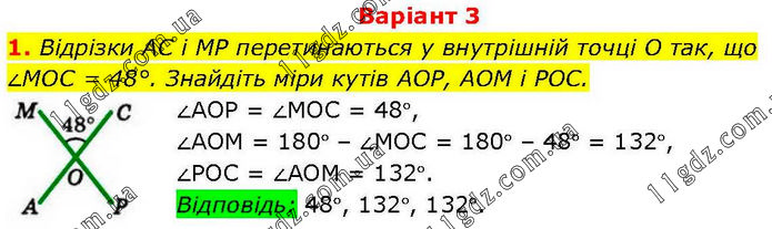Варіант 3 1. Відрізки AC і MP перетинаються у внутрішній точці O так, що ∠MOC = 48°. Знайдіть міри кутів AOP, AOM і РОС. ∠АОР = ∠МОС = 48°, ∠АОМ = 180° – ∠МОС = 180° – 48° = 132°, ∠РОС = ∠АОМ = 132°. Відповідь: 48°, 132°, 132°.