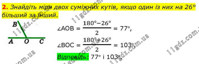 Знайдіть міри двох суміжних кутів, якщо один із них на 26° більший за інший. ∠АОВ = (180°-26°)/2 = 77°, ∠ВОС = (180°+26°)/2 = 103°. Відповідь: 77° і 103°.