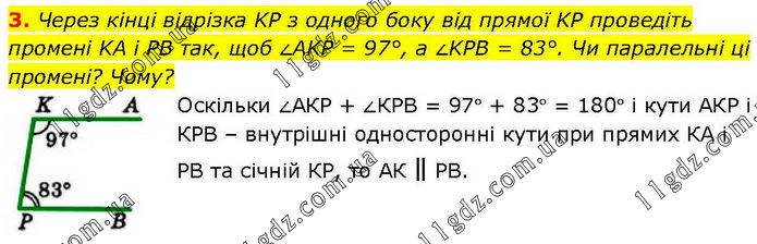 Через кінці відрізка KP з одного боку від прямої KP проведіть промені KA і PB так, щоб ∠AKP = 97°, a ∠KPB = 83°. Чи паралельні ці промені? Чому? Оскільки ∠АКР + ∠КРВ = 97° + 83° = 180° і кути АКР і КРВ – внутрішні односторонні кути при прямих КА і РВ та січній КР, то АК ∥ РВ.