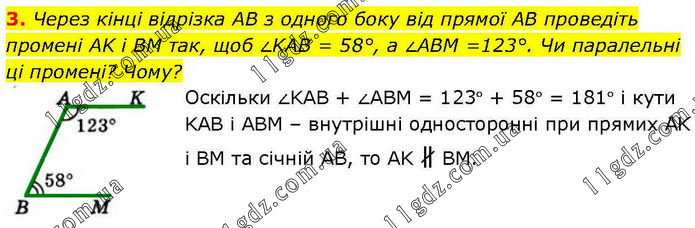 Через кінці відрізка AB з одного боку від прямої AB проведіть промені AK і BM так, щоб ∠KAB = 58°, a ∠ABM =123°. Чи паралельні ці промені? Чому? Оскільки ∠KАВ + ∠АВM = 123° + 58° = 181° і кути KАВ і АВM – внутрішні односторонні при прямих АK і ВM та січній АВ, то АK ∦ ВM.