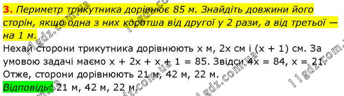 Периметр трикутника дорівнює 85 м. Знайдіть довжини його сторін, якщо одна з них коротша від другої у 2 рази, а від третьої — на 1 м. Нехай сторони трикутника дорівнюють х м, 2х см і (х + 1) см. За умовою задачі маємо х + 2х + х + 1 = 85. Звідси 4х = 84, х = 21. Отже, сторони дорівнюють 21 м, 42 м, 22 м. Відповідь: 21 м, 42 м, 22 м.