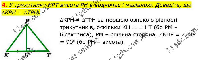 У трикутнику KPT висота PН є водночас і медіаною. Доведіть, що ∆KPН = ∆TPH. ∆КРН = ∆ТРН за першою ознакою рівності трикутників, оскільки КН = НТ (бо РМ – бісектриса), РМ – спільна сторона, ∠КНР = ∠ТНР = 90° (бо РН – висота).