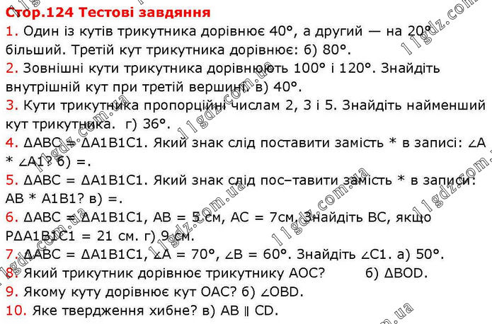 Стор.124 Тестові завдяння 1. Один із кутів трикутника дорівнює 40°, а другий — на 20° більший. Третій кут трикутника дорівнює: б) 80°. 2. Зовнішні кути трикутника дорівнюють 100° і 120°. Знайдіть внутрішній кут при третій вершині. в) 40°. 3. Кути трикутника пропорційні числам 2, 3 і 5. Знайдіть найменший кут трикутника. г) 36°. 4. ∆ABC = ∆A1В1C1. Який знак слід поставити замість * в записі: ∠A * ∠A1? б) =. 5. ∆АВС = ∆A1B1C1. Який знак слід пос–тавити замість * в записи: AB * A1B1? в) =. 6. ∆АВС = ∆A1B1C1, AB = 5 см, AC = 7см. Знайдіть BC, якщо P∆A1B1C1 = 21 см. г) 9 см. 7. ∆АВС = ∆A1B1C1, ∠A = 70°, ∠B = 60°. Знайдіть ∠C1. а) 50°. 8. Який трикутник дорівнює трикутнику АОС? б) ∆BOD. 9. Якому куту дорівнює кут ОАС? б) ∠OBD. 10. Яке твердження хибне? в) AB ∥ CD.