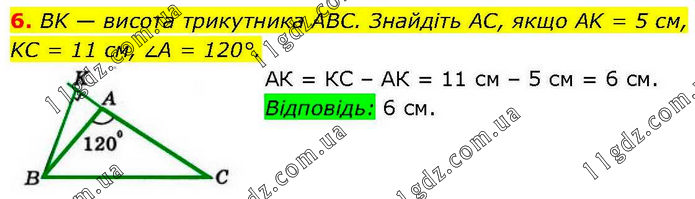 BK — висота трикутника ABC. Знайдіть AC, якщо AK = 5 см, KC = 11 см, ∠A = 120°. АК = КС – АК = 11 см – 5 см = 6 см. Відповідь: 6 см.