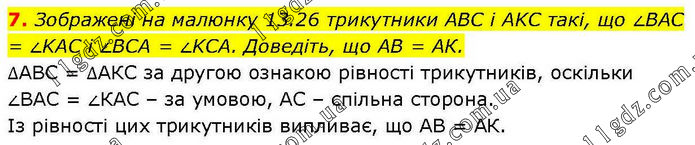 Зображені на малюнку 13.26 трикутники ABC і AKC такі, що ∠BAC = ∠KAC і ∠BCA = ∠KCА. Доведіть, що AB = AК. ∆АВС = ∆АКС за другою ознакою рівності трикутників, оскільки ∠ВАС = ∠КАС – за умовою, АС – спільна сторона. Із рівності цих трикутників випливає, що АВ = АК.