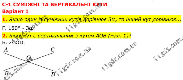 С-1 СУМІЖНІ TA ВЕРТИКАЛЬНІ КУТИ Варіант 1 1. Якщо один із суміжних кутів дорівнює 3α, то інший кут дорівнює... Г. 180° - Зα. 2. Який кут є вертикальним з кутом AOB (мал. 1)? Б. ∠COD.
