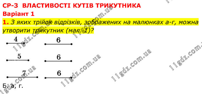 CP-3 ВЛАСТИВОСТІ КУТІВ ТРИКУТНИКА Варіант 1 1. З яких трійок відрізків, зображених на малюнках а-г, можна утворити трикутник (мал. 1)? Б. а, г.
