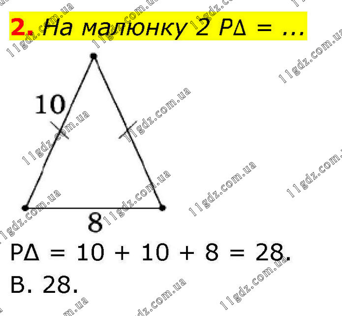 2. Ha малюнку 2 P∆ = ... P∆ = 10 + 10 + 8 = 28. B. 28.