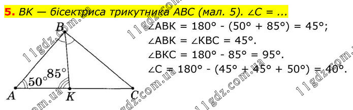 5. BK — бісектриса трикутника ABC (мал. 5). ∠C = ... ∠АВК = 180° - (50° + 85°) = 45°; ∠АВК = ∠КВС = 45°. ∠ВКС = 180° - 85° = 95°. ∠С = 180° - (45° + 45° + 50°) = 40°.