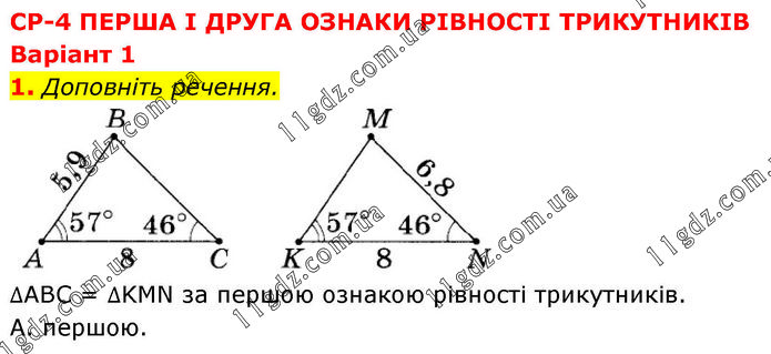 CP-4 ПЕРША I ДРУГА ОЗНАКИ РІВНОСТІ ТРИКУТНИКІВ Варіант 1 1. Доповніть речення. ∆ABC = ∆KMN за першою ознакою рівності трикутників. A. першою.