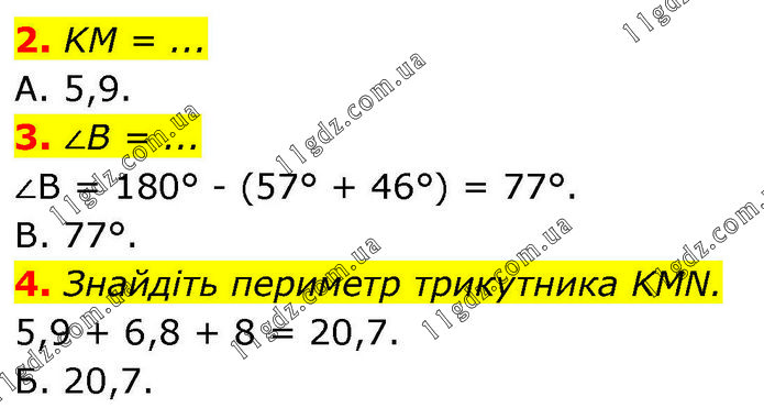 2. KM = ... A. 5,9. 3. ∠B = ... ∠В = 180° - (57° + 46°) = 77°. B. 77°. 4. Знайдіть периметр трикутника KMN. 5,9 + 6,8 + 8 = 20,7. Б. 20,7.