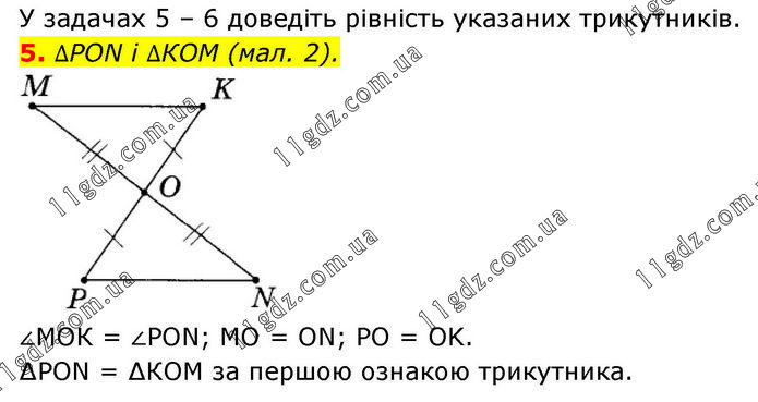 5. ∆PON і ∆КОМ (мал. 2). ∠МОК = ∠РON; MO = ON; PO = OK. ∆PON = ∆КОМ за першою ознакою трикутника.