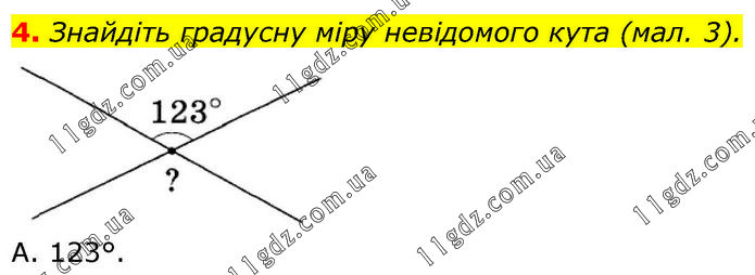 4. Знайдіть градусну міру невідомого кута (мал. 3). A. 123°.
