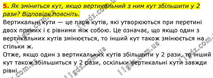 5. Як зміниться кут, якщо вертикальний з ним кут збільшити у 2 рази? Відповідь поясніть. Вертикальні кути — це пари кутів, які утворюються при перетині двох прямих і є рівними між собою. Це означає, що якщо один з вертикальних кутів змінюється, то інший кут також змінюється на стільки ж. Отже, якщо один з вертикальних кутів збільшити у 2 рази, то інший кут також збільшиться у 2 рази, оскільки вертикальні кути завжди рівні.