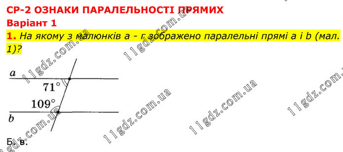 СР-2 ОЗНАКИ ПАРАЛЕЛЬНОСТІ ПРЯМИХ Варіант 1 1. На якому з малюнків а - г зображено паралельні прямі а і b (мал. 1)? Б. в.