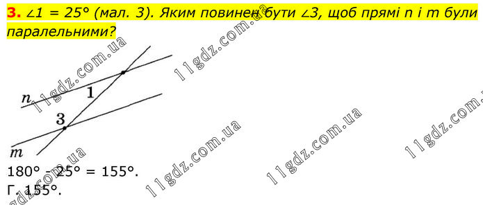 3. ∠1 = 25° (мал. 3). Яким повинен бути ∠3, щоб прямі n і m були паралельними? 180° - 25° = 155°. Г. 155°.
