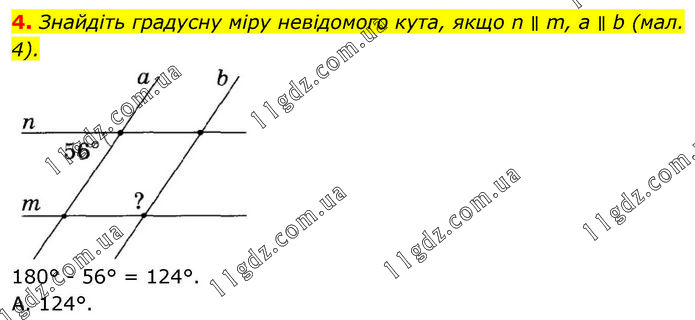 4. Знайдіть градусну міру невідомого кута, якщо n ∥ m, а ∥ b (мал. 4). 180° - 56° = 124°. A. 124°.