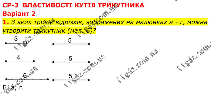 CP-3 ВЛАСТИВОСТІ КУТІВ ТРИКУТНИКА Варіант 2 1. З яких трійок відрізків, зображених на малюнках а - г, можна утворити трикутник (мал. 6)? Б. а, г.