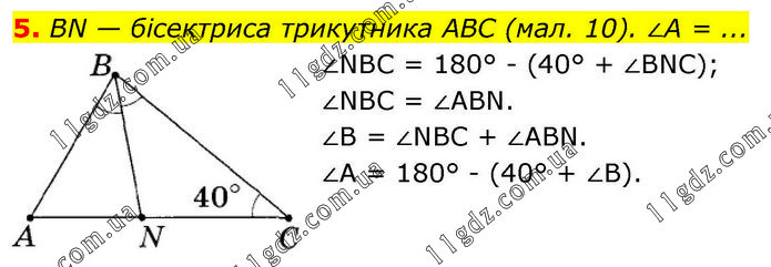 5. BN — бісектриса трикутника ABC (мал. 10). ∠A = ... ∠NBC = 180° - (40° + ∠BNC); ∠NBC = ∠ABN. ∠В = ∠NBC + ∠ABN. ∠A = 180° - (40° + ∠В).