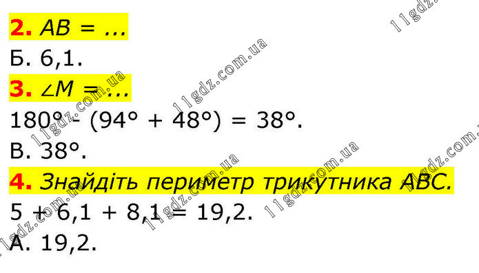 2. AB = ... Б. 6,1. 3. ∠M = ... 180° - (94° + 48°) = 38°. B. 38°. 4. Знайдіть периметр трикутника ABC. 5 + 6,1 + 8,1 = 19,2. A. 19,2.