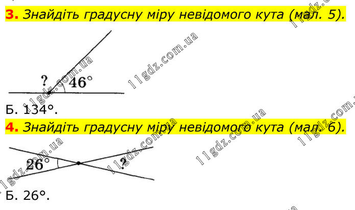 3. Знайдіть градусну міру невідомого кута (мал. 5). Б. 134°. 4. Знайдіть градусну міру невідомого кута (мал. 6). Б. 26°.