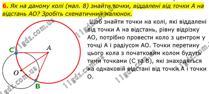 6. Як на даному колі (мал. 8) знайти точки, віддалені від точки А на відстань AO? Зробіть схематичний малюнок. Щоб знайти точки на колі, які віддалені від точки A на відстань, рівну відрізку AO, потрібно провести коло з центром у точці A і радіусом AO. Точки перетину цього кола з початковим колом будуть тими точками (С та В), які знаходяться на однаковій відстані від точки A і точки O.