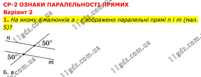 СР-2 ОЗНАКИ ПАРАЛЕЛЬНОСТІ ПРЯМИХ Варіант 2 1. На якому з малюнків а - г зображено паралельні прямі n і m (мал. 5)? Б. в.