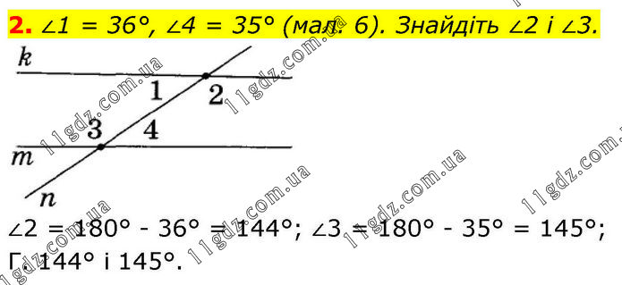 2. ∠1 = 36°, ∠4 = 35° (мал. 6). Знайдіть ∠2 і ∠3. ∠2 = 180° - 36° = 144°; ∠3 = 180° - 35° = 145°; Г. 144° і 145°.