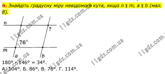 4. Знайдіть градусну міру невідомого кута, якщо n ∥ m, а ∥ b (мал. 8). 180° - 146° = 34°. A. 104°. Б. 86°. B. 76°. Г. 114°.