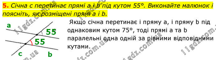 Січна с перетинає прямі а і b під кутом 55°. Виконайте малюнок і поясніть, як розміщені прямі а і b. Якщо січна перетинає і пряму а, і пряму b під однаковим кутом 75°, тоді прямі a та b паралельні одна одній за рівними відповідними кутами.