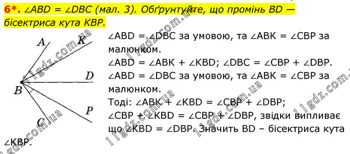 6*. ∠ABD = ∠DBC (мал. 3). Обґрунтуйте, що промінь BD — бісектриса кута KBP. ∠ABD = ∠DBC за умовою, та ∠ABК = ∠СВР за малюнком. ∠ABD = ∠ABК + ∠KBD; ∠DBC = ∠СВР + ∠DBP. ∠ABD = ∠DBC за умовою, та ∠ABК = ∠СВР за малюнком. Тоді: ∠ABК + ∠KBD = ∠СВР + ∠DBP; ∠СВР + ∠KBD = ∠СВР + ∠DBP, звідки випливає що ∠KBD = ∠DBP. Значить BD – бісектриса кута ∠KBР.