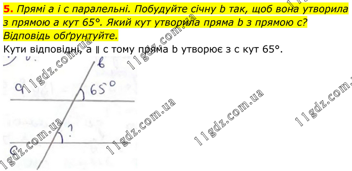 5. Прямі а і с паралельні. Побудуйте січну b так, щоб вона утворила з прямою а кут 65°. Який кут утворила пряма b з прямою с? Відповідь обґрунтуйте. Кути відповідні, а ∥ с тому пряма b утворює з с кут 65°.
