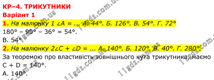 КР–4. ТРИКУТНИКИ Варіант 1 1. На малюнку 1 ∠A = ... А. 44°. Б. 126°. В. 54°. Г. 72° 180° – 90° – 36° = 54°. В. 54°. 2. На малюнку 2∠C + ∠D = ... А. 140°. Б. 120°. В. 40°. Г. 280°. За теоремою про властивість зовнішнього кута трикутника, маємо C + D = 140°. А. 140°.