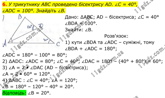 У трикутнику ABC проведено бісектрису AD. ∠C = 40°, ∠ADC = 100°. Знайдіть ∠B. Дано: ∆АВС; AD – бісектриса; ∠С = 40° ∠BDA = 100°. Знайти: ∠В. Розв'язок: 1) кути ∠BDA та ∠ADC – суміжні, тому ∠BDA + ∠ADC = 180°; ∠ADC = 180° – 100° = 80°; 2) ∆ADC: ∠ADC = 80°; ∠C = 40°; ∠DAC = 180° – (40° + 80°) = 60°; 3) ∠A = 2 • ∠DAC (AD – бісектриса); ∠A = 2 • 60° = 120°. 4) ∆ABC : ∠C = 40°; ∠A = 120°; ∠B = 180° – 120° – 40° = 20°. Відповідь: ∠В = 20°.