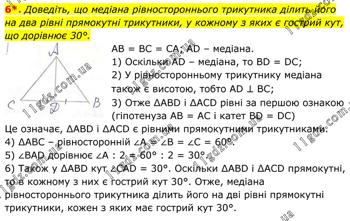 Доведіть, що медіана рівностороннього трикутника ділить його на два рівні прямокутні трикутники, у кожному з яких є гострий кут, що дорівнює 30°. АВ = ВС = СА; AD – медіана. 1) Оскільки AD – медіана, то BD = DC; 2) У рівносторонньому трикутнику медіана також є висотою, тобто AD ⊥ BC; 3) Отже ∆ABD і ∆ACD рівні за першою ознакою (гіпотенуза AB = AC і катет BD = DC) Це означає, ∆ABD і ∆ACD є рівними прямокутними трикутниками. 4) ∆ABC – рівносторонній ∠A = ∠B = ∠C = 60°. 5) ∠BAD дорівнює ∠A : 2 = 60° : 2 = 30°. 6) Tакож у ∆ABD кут ∠CAD = 30°. Oскільки ∆ABD і ∆ACD прямокутні, то в кожному з них є гострий кут 30°. Отже, медіана рівностороннього трикутника ділить його на дві рівні прямокутні трикутники, кожен з яких має гострий кут 30°.