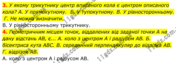 3. У якому трикутнику центр вписаного кола є центром описаного кола? А. У прямокутному. Б. У тупокутному. В. У рівносторонньому. Г. He можна визначити. В. У рівносторонньому трикутнику. 4. Геометричним місцем точок, віддалених від заданої точки А на дану відстань AВ, є... A. коло з центром А і радіусом AB. Б. бісектриса кута ABC. B. серединний перпендикуляр до відрізка AB. Г. відрізок AB. А. коло з центром А і радіусом AB.