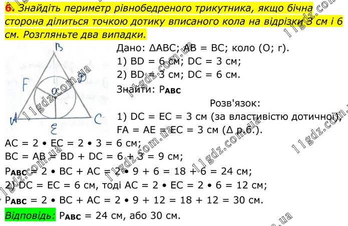 Знайдіть периметр рівнобедреного трикутника, якщо бічна сторона ділиться точкою дотику вписаного кола на відрізки З см і 6 см. Розгляньте два випадки. Дано: ∆АВС; АВ = ВС; коло (О; r). 1) BD = 6 см; DC = 3 см; 2) BD = 3 см; DC = 6 см. Знайти: РАВС Розв'язок: 1) DC = EC = 3 см (за властивістю дотичної), FA = AE = EC = 3 см (∆ р.б.). АС = 2 • ЕС = 2 • 3 = 6 см; BC = AB = BD + DC = 6 + 3 = 9 см; РАВС = 2 • ВС + АС = 2 • 9 + 6 = 18 + 6 = 24 см; 2) DC = EC = 6 см, тоді АС = 2 • ЕС = 2 • 6 = 12 см; РАВС = 2 • ВС + АС = 2 • 9 + 12 = 18 + 12 = 30 см. Відповідь: РАВС = 24 см, або 30 см.