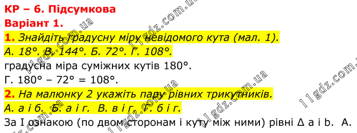 КР – 6. Підсумкова Варіант 1. 1. Знайдіть градусну міру невідомого кута (мал. 1). А. 18°. В. 144°. Б. 72°. Г. 108°. градусна міра суміжних кутів 180°. Г. 180° – 72° = 108°. 2. На малюнку 2 укажіть пару рівних трикутників. А. а і б. Б. а і г. В. в і г. Г. б і г. За І ознакою (по двом сторонам і куту між ними) рівні ∆ a і b. A.