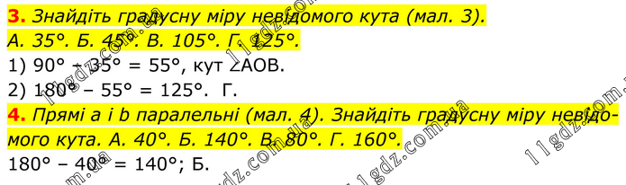 3. Знайдіть градусну міру невідомого кута (мал. 3). А. 35°. Б. 45°. В. 105°. Г. 125°. 1) 90° – 35° = 55°, кут ∠АОВ. 2) 180° – 55° = 125°. Г. 4. Прямі а і b паралельні (мал. 4). Знайдіть градусну міру невідо мого кута. А. 40°. Б. 140°. В. 80°. Г. 160°. 180° – 40° = 140°; Б.