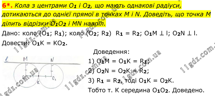Кола з центрами O1 і O2, що мають однакові радіуси, дотикаються до однієї прямої в точках M i N. Доведіть, що точка M ділить відрізки O1O2 і MN навпіл. Дано: коло (O1; R1); коло (O2; R2) R1 = R2; O1M ⊥ l; O2N ⊥ l. Довести: O1K = KO2. Доведення: 1) O1M = O1K = R1; 2) O2N = O2K = R2; 3) R1 = R2, тоді O1K = O2K. Тобто т. К середина O1O2. Доведено.