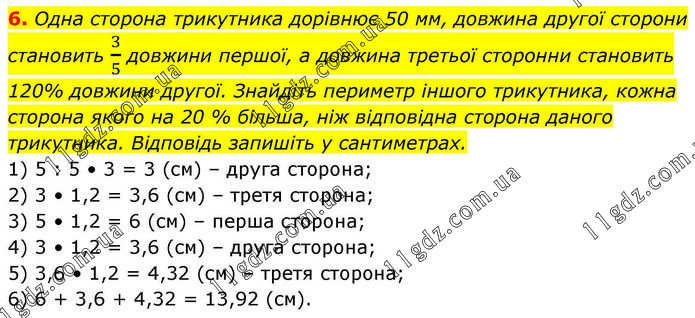 6. Одна сторона трикутника дорівнює 50 мм, довжина другої сторони становить 3/5 довжини першої, а довжина третьої сторонни становить 120% довжини другої. Знайдіть периметр іншого трикутника, кожна сторона якого на 20 % більша, ніж відповідна сторона даного трикутника. Відповідь запишіть у сантиметрах. 1) 5 : 5 • 3 = 3 (см) – друга сторона; 2) 3 • 1,2 = 3,6 (см) – третя сторона; 3) 5 • 1,2 = 6 (см) – перша сторона; 4) 3 • 1,2 = 3,6 (см) – друга сторона; 5) 3,6 • 1,2 = 4,32 (см) – третя сторона; 6) 6 + 3,6 + 4,32 = 13,92 (см).