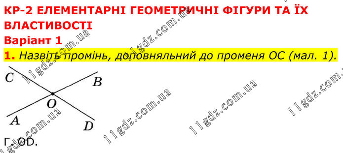 КР-2 ЕЛЕМЕНТАРНІ ГЕОМЕТРИЧНІ ФІГУРИ TA ЇХ ВЛАСТИВОСТІ Варіант 1 1. Назвіть промінь, доповняльний до променя OC (мал. 1). Г. OD.