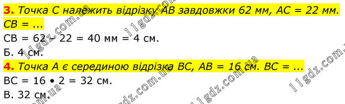 3. Точка C належить відрізку AB завдовжки 62 мм, AC = 22 мм. CB = ... CB = 62 – 22 = 40 мм = 4 см. Б. 4 см. 4. Точка А є серединою відрізка BC, AB = 16 см. BC = ... BC = 16 • 2 = 32 см. В. 32 см.