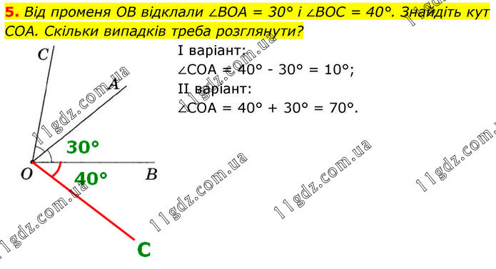 5. Від променя OB відклали ∠BOA = 30° і ∠BOC = 40°. Знайдіть кут СОА. Скільки випадків треба розглянути? І варіант: ∠СОА = 40° - 30° = 10°; ІІ варіант: ∠СОА = 40° + 30° = 70°.