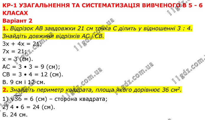 КР-1 УЗАГАЛЬНЕННЯ TA СИСТЕМАТИЗАЦІЯ ВИВЧЕНОГО В 5 - 6 КЛАСАХ Варіант 2 1. Відрізок AB завдовжки 21 см точка C ділить у відношенні 3 : 4. Знайдіть довжини відрізків AC і CB. 3х + 4х = 21; 7х = 21; х = 3 (см). АС = 3 • 3 = 9 (см); СВ = 3 • 4 = 12 (см). В. 9 см і 12 см. 2. Знайдіть периметр квадрата, площа якого дорівнює 36 см2. 1) √36 = 6 (см) – сторона квадрата; 2) 4 • 6 = 24 (см). Б. 24 см.