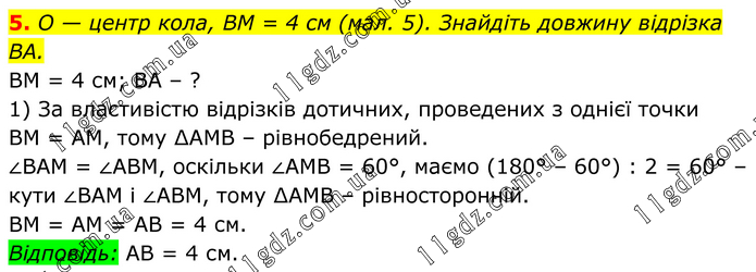 O — центр кола, BM = 4 см (мал. 5). Знайдіть довжину відрізка ВА. ВМ = 4 см; ВА – ? 1) За властивістю відрізків дотичних, проведених з однієї точки BM = АМ, тому ∆AMB – рівнобедрений. ∠ВАМ = ∠АВМ, оскільки ∠АМВ = 60°, маємо (180° – 60°) : 2 = 60° – кути ∠ВАМ і ∠АВМ, тому ∆АМВ – рівносторонній. ВМ = АМ = АВ = 4 см. Відповідь: АВ = 4 см.