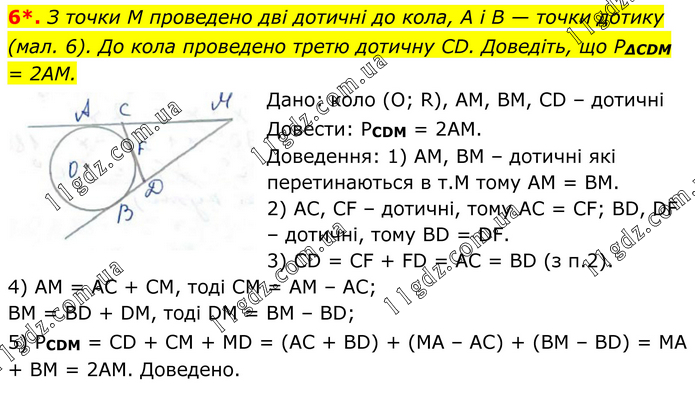 З точки M проведено дві дотичні до кола, A i B — точки дотику (мал. 6). До кола проведено третю дотичну CD. Доведіть, що P∆CDM = 2AM. Дано: коло (О; R), AM, BM, CD – дотичні Довести: РCDM = 2AM. Доведення: 1) АМ, ВМ – дотичні які перетинаються в т.М тому АМ = ВМ. 2) АС, CF – дотичні, тому AC = CF; BD, DF – дотичні, тому BD = DF. 3) CD = CF + FD = AC = BD (з п.2). 4) AM = AC + CM, тоді CM = AM – AC; BM = BD + DM, тоді DM = BM – BD; 5) PCDM = CD + CM + MD = (AC + BD) + (MA – AC) + (BM – BD) = MA + BM = 2AM. Доведено.