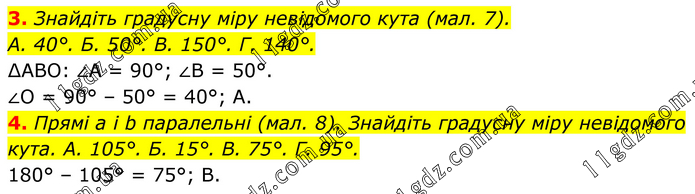 3. Знайдіть градусну міру невідомого кута (мал. 7). А. 40°. Б. 50°. В. 150°. Г. 140°. ∆АВО: ∠A = 90°; ∠B = 50°. ∠O = 90° – 50° = 40°; A. 4. Прямі а і b паралельні (мал. 8). Знайдіть градусну міру невідомого кута. А. 105°. Б. 15°. В. 75°. Г. 95°. 180° – 105° = 75°; В.